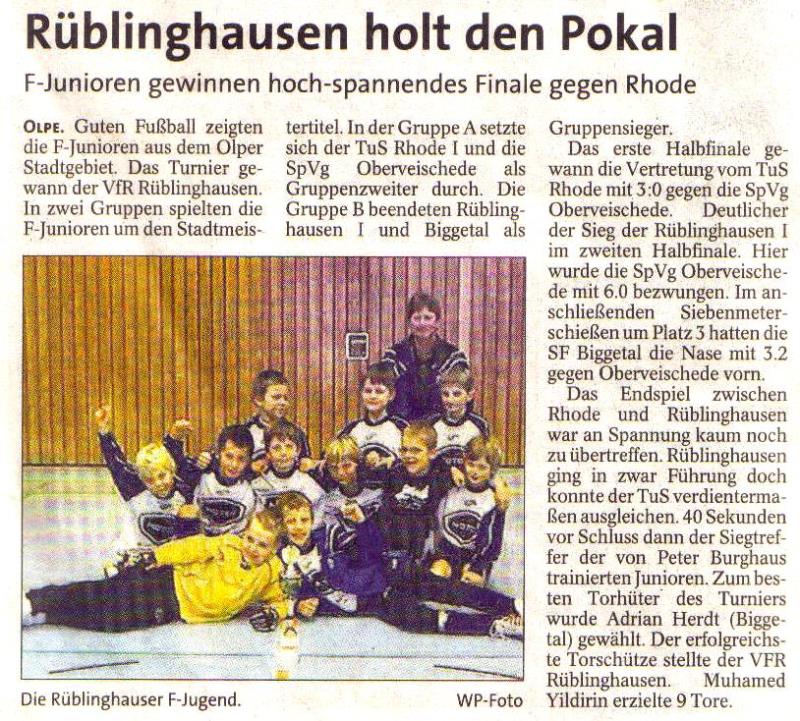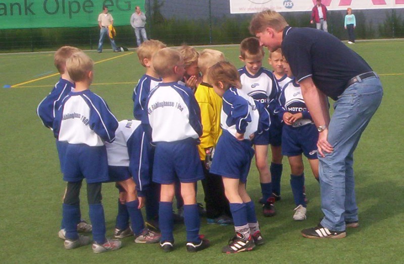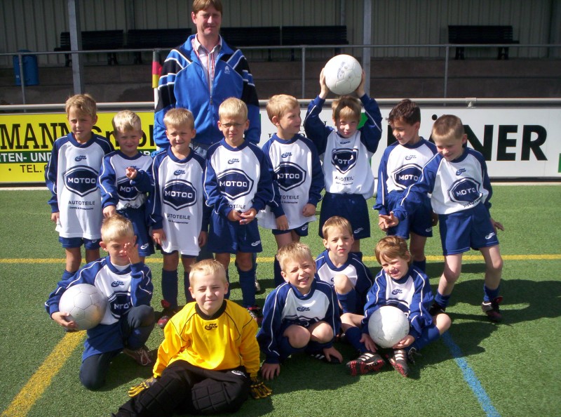 Die Spieler der F-Jugend-2 mit Trainer Peter Burghaus. Stehend von links: Tim Spitzer, Tim Rademacher, Martin Halbe, Sven Halbe, Sebastian Gipperich, Thomas Burghaus, Muhammed Yildirim, Jonas Thöne, Kniend von links: Erik Maienberg, Fabian Zeppenfeld, Frederik Kraus, Matthias Cürten, Vanessa Junker