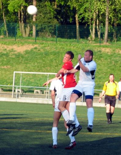 In dieser Aufnahme kaum zu vermuten, doch Peter Kleine köpft hier zum entscheidenden Tor ein. In einem offenen Spiel gewann die Rüblinghauser Reserve mit 4 : 2 gegen die Sportfreunde aus dem Biggetal. Obwohl es nach der schnellen 2 : 0 Führung nach einer klaren Angelegenheit aussah, konnten die Biggetaler noch in der ersten Halbzeit zum 2 : 2 ausgleichen. Anhand der besseren Torchancen ist der Sieg verdient und wichtig für die Moral der Mannschaft. Nach dem Führungstor von Adrian Wurm konnte Christian Melcher mit 2 Toren sein Können unter Beweis stellen. Der Siegtreffer fiel, wie oben abgebildet in der 80. Minute.